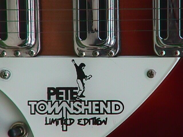 | 1998 Pete Townshend Signature Model Immaculate fireglo signature features classic windmill pose on white pickguard, 3 vintage pickups, r tailpiece, f-hole, original hardshell case. Serial # J0 7596 (Oct '87), one of the earliest of the 250 made. SOLD thanks CW! |