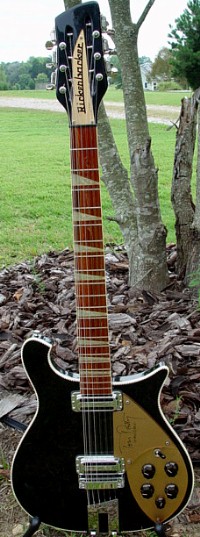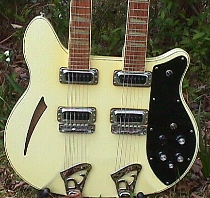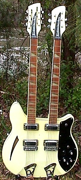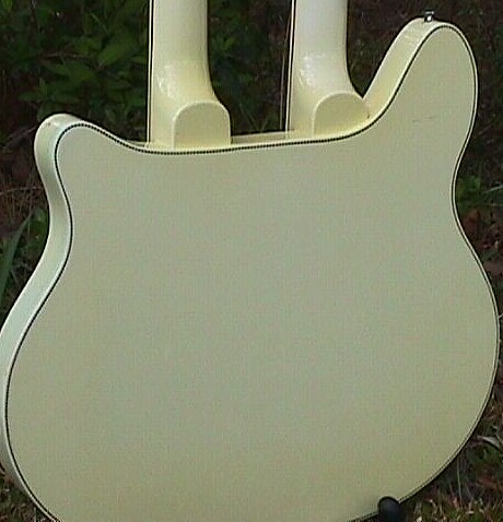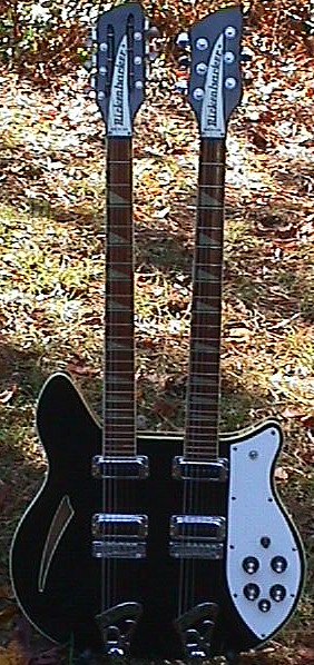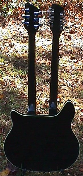 ![]() | 362 Doubleneck Jetglo Whoa! Does this Rick ring out! Very rare jetglo black semi-acoustic with 6 and 12 string guitar necks. Checker binding, R tailpieces. This is a very early one #NL 7424 December 1974. Photo of the back. All original including huge hardshell case. $5495 SOLD |