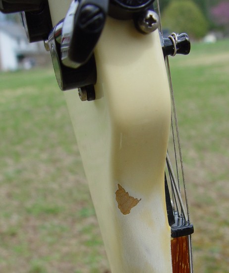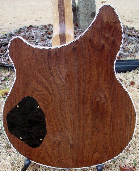 ![]() | 4003 Montezuma Brown 2003 Color of the year held over, white binding, triangular inlays, bound fingerboard, hardshell case body close up SOLD |