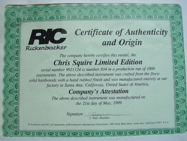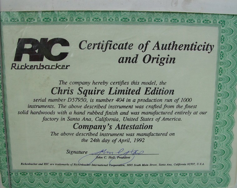 ![]() | 4001 Chris Squire Signature Nicest one we'll ever had.. no marks at all, factory fresh, all paperwork, signed by Chris Squire too, vintage reissue silver hardshell case, all paperwork, certificate #834, Serial #99 21124 (May 21, 1999).